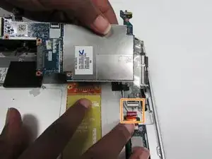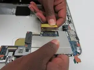 Разблокируйте разъём с нулевой силой вставки (ZIF), к которому подключён кабель сенсорного экрана, затем отсоедините кабель сенсорного экрана от материнской платы.