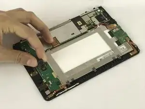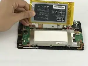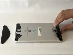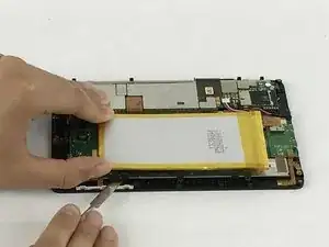 Используйте пластиковую лопатку, чтобы извлечь батарею из устройства — она приклеена к металлической рамке.