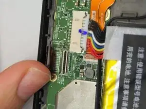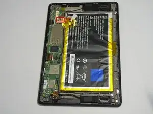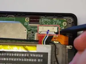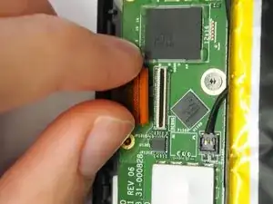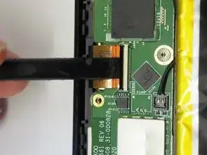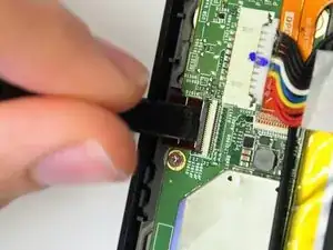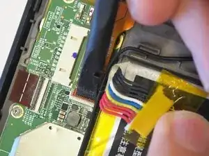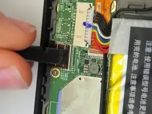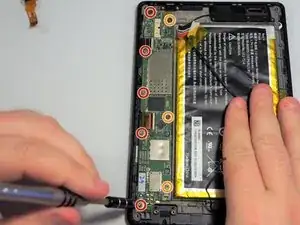 Используя нейлоновую лопатку, аккуратно приподнимите материнскую плату и выньте её из планшета. Материнская плата теперь должна быть полностью отключена.