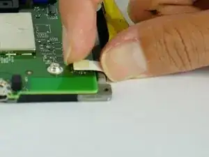 Переверните крошечный бело-кремовый фиксатор наклонными точными пинцетами в сторону аккумулятора.