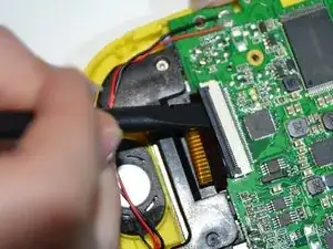Используйте плоский конец лопатки, чтобы приподнять черные панели, закрывающие три шлейфа, подключенные к материнской плате.