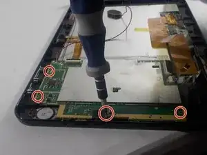 Найдите и снимите четыре винта, удерживающие материнскую плату в устройстве, используя крестовую отвёртку.