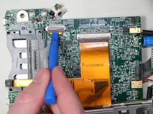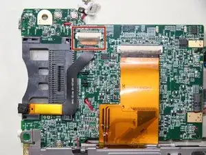 Материнская плата и узел экрана всё ещё соединены ленточным кабелем, который может быть повреждён при сильном натяжении.