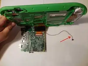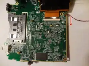 Поднимите материнскую плату, чтобы обнажить четвёртый и последний провод. После подъёма материнской платы потяните провод вниз, чтобы отсоединить его.