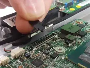 Найдите переплетённые чёрный и красный провода, которые соединяют два маленьких чёрных динамика с материнской платой, как показано на фото.