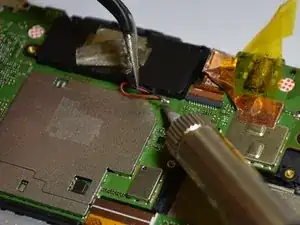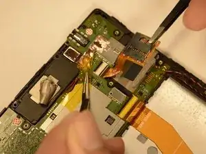 Жёлтая лента удерживает разъём считывателя microSD. Зафиксируйте ленту пинцетом.