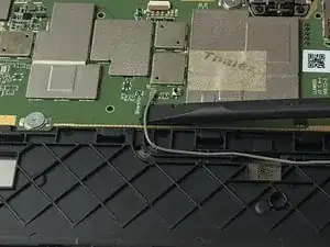 Проследив за серым проводом с нижнего края, найдите разъём модуля Wi-Fi на материнской плате. Аккуратно отсоедините его с помощью лопатки.