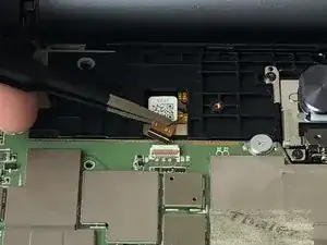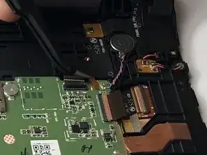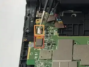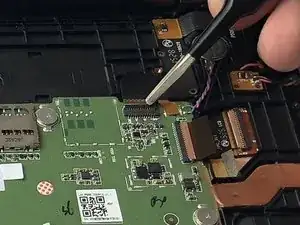 Продвигаясь далее по верхнему краю материнской платы, отключите белый разъём ЖК-дисплея, отключив бежевый фиксатор и вытянув провод пинцетом.