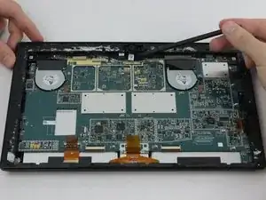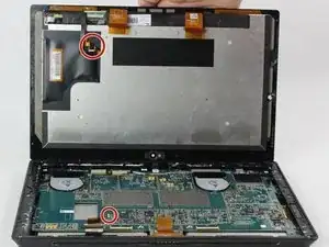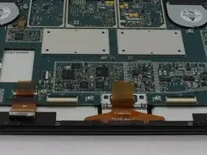 Отсоедините оранжевые кабели, соединяющие экран с материнской платой, потянув за маленькие вкладки. Используя нейлоновую лопатку, освободите эти кабели.