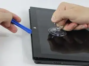 Используя пластиковый инструмент для открытия и присоску для дополнительного рычага, осторожно вставьте один край инструмента под угол экрана.