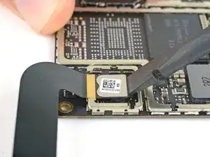 Вставьте один наконечник пары острой пинцетов в зазор в углу экрана ЭМП, закрывающего разъём шлейфа дисплея.