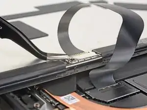 Используйте плоский конец лопатки, чтобы извлечь шлейф дисплея прямо вверх из разъёма на материнской плате.