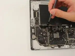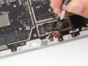 Используйте отвертку Torx T3, чтобы снять один винт 2,5 мм на материнской плате.