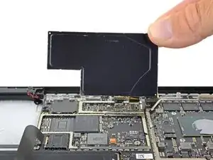 Воспользуйтесь плоским концом лопатки, чтобы поддеть один край экрана ЭМП, закрывающего плату дисплея.