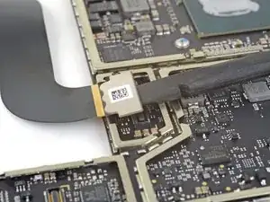 Воспользуйтесь плоским концом лопатки, чтобы поднять кабель соединения дисплея прямо вверх и извлечь его из разъёма на плате.