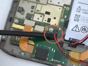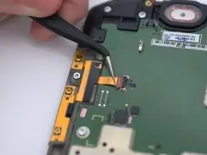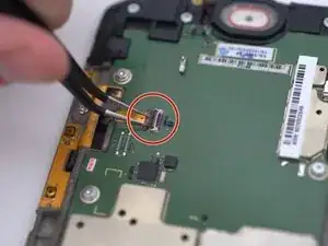 С помощью пинцета или монтажного инструмента аккуратно отсоедините кабель разъёма динамика от материнской платы.