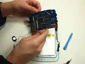 Осторожно приподнимите материнскую плату. Ваши вспомогательные компоненты — аккумулятор, динамик, узел кнопки громкости и шлейфы камеры — будут отключены, а не подключены, как показано на этом изображении.