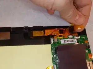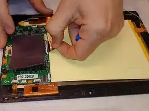 Начните с переворачивания планшета экраном вниз. Осторожно используйте пластиковый инструмент для открытия, чтобы снять крышку. Начните с угла, противоположного кнопке гибернации.