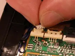 Отключите чёрный гибкий кабель, проходящий над аккумулятором. Поднимите чёрный зажим вверх и извлеките кабель.