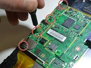 Используйте крестовую отвёртку, чтобы вывернуть 4 чёрных винта, крепящих материнскую плату к корпусу устройства.