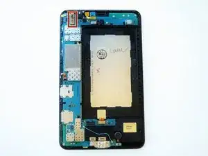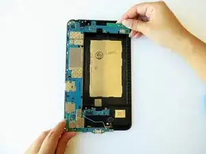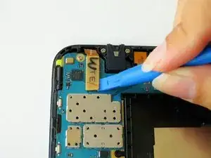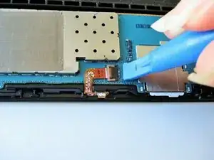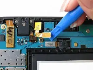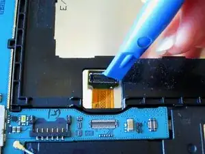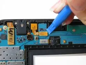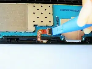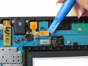 Продолжайте поддевать синей пластиковой лопаткой по периметру планшета, чтобы отделить заднюю пластиковую крышку от передней сборки.