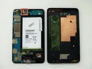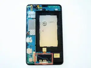 Шлейф передней камеры расположен прямо над аккумулятором, немного слева.