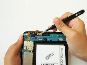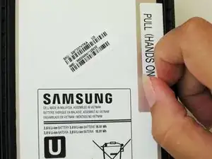Зажав язычок большим и указательным пальцами, потяните его вверх, чтобы отделить верхний правый угол аккумулятора от передней панели сборки.