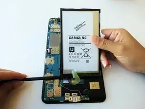 Если аккумулятор сопротивляется из‑за клея, проведите плоским концом лопатки между аккумулятором и передней панелью сборки.