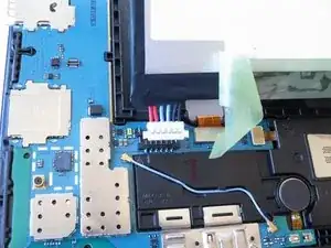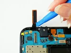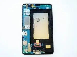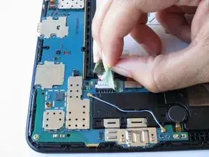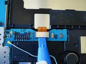 Нанесите небольшое давление и сдвиньте синюю пластиковую лопатку вниз, чтобы выщелкнуть металлический прямоугольный разъём задней камеры из гнезда на логической плате.