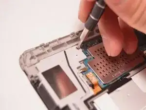 Уберите винты Phillips #00 из пластиковой части, прижимающей материнскую плату.