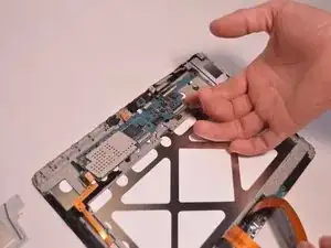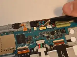 Используйте пластиковые пинцеты, чтобы аккуратно отсоединить фронтальную камеру от материнской платы.