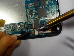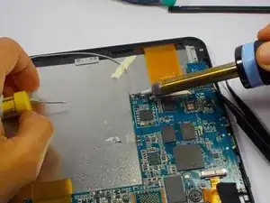 Используйте паяльник и оплётку для выпайки, чтобы выпаять красный и чёрный контакты аккумулятора с материнской платы.