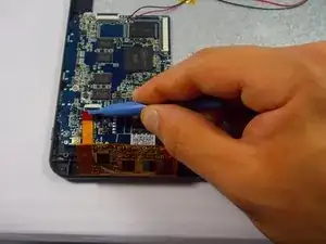 Используйте пластиковую лопатку, чтобы приподнять чёрную защёлку, в которой закреплены шлейфы на материнской плате.