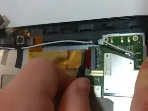 Отсоедините разъём питания аккумулятора, сдвинув белую пластмассовую вилку вниз, отводя её от платы.