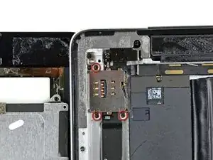 Снимите три винта Phillips 2 мм, которые крепят слот SIM к задней панели.
