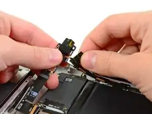 С помощью пластикового инструмента помогите вытащить разъём наушников из его углубления в верхнем крае iPad.