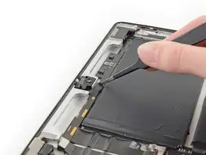 Используя медиатор для вскрытия, который всё ещё находится под нижним краем iPad, освободите клей по нижнему левому углу.