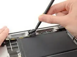 Антенна прикреплена к нижней части iPad с помощью винтов и кабеля. Этот шаг отделяет антенну от передней панели, чтобы при снятии панели антенна не была повреждена.