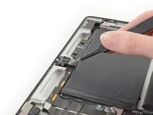 Используйте плоский конец лопатки, чтобы поджать защёлку удерживающей язычок на ZIF-разъёме шлейфа микрофона.