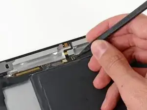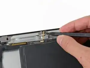 Антенна крепится к нижней части iPad винтами и кабелем. Этот шаг отделяет антенну от передней панели, гарантируя, что при снятии панели антенна не будет повреждена.