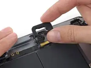 Используйте наконечник медиатора, чтобы перевернуть фиксирующую защёлку ZIF-разъёма кабеля микрофона.
