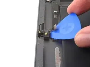 Используйте лопатку, инструмент для вскрытия или ноготь, чтобы поднять небольшой шарнирный фиксатор на ZIF-разъёме кабеля кнопки «Домой».