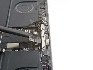 Используйте лопатку, чтобы поддеть и отключить два верхних защёлкивающихся разъёма кабеля дисплея.