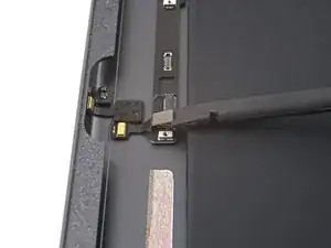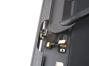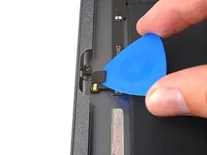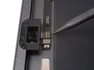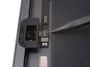Воспользуйтесь плоским концом лопатки, чтобы поддеть и отключить пресс-разъём кабеля ЖК-дисплея.
