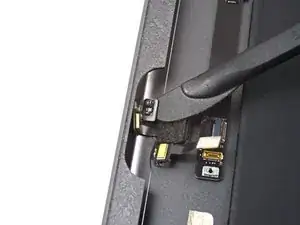 Воспользуйтесь лопаткой, инструментом для вскрытия или ногтем, чтобы поднять маленькую поворотную фиксирующую пластину на разъёме ZIF кабеля кнопки Home.