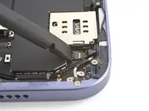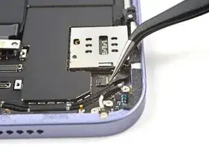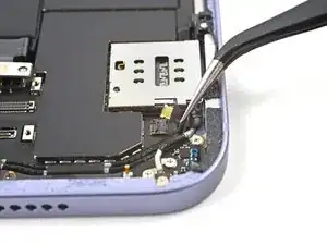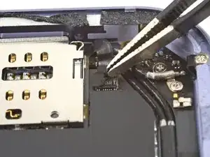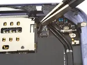 Воспользуйтесь парой пинцетов, чтобы вытащить кабель SIM-считывателя прямо из разъёма на раме.