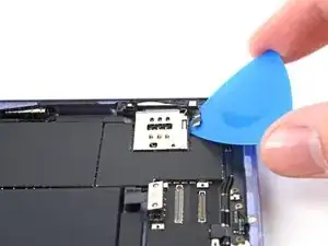 Вставьте инструмент для вскрытия между рамой и краем SIM-считывателя, ближайшим к его разъёму ZIF.