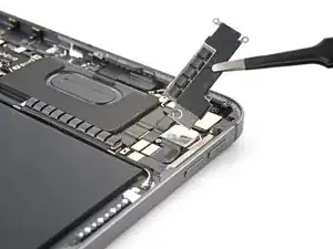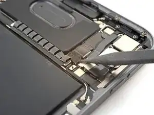 Используйте лопатку, чтобы поддеть и отсоединить плоский разъём шлейфа верхней кнопки питания.