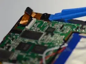 Поднимите чёрную вкладку на материнской плате с помощью инструмента, и вытащите шлейф из слота под чёрной вкладкой.