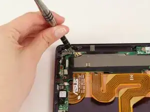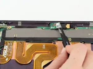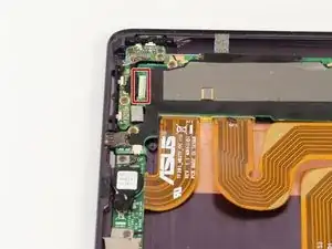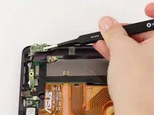 С помощью пинцета отогните полосу чёрной ленты, закрывающую соединение между электронной частью кнопок блокировки и громкости и материнской платой.